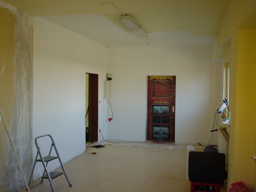 Ich habe Tapeziergrund gestrichen über die frischen Zementstellen, weil das recht stark saugt und die Tapete dort nicht gescheit hält, außerdem habe ich einen weiteren Teil des Abhörraums gestrichen. In weiß schaut das Ganze schon etwas freundlicher aus. Außerdem habe ich den Ölfleck mit Isoliergrund überstrichen, in der Hoffnung, daß das besser hält. Fiese Lösungsmittel auf jeden Fall: verursacht Schläfrigkeit.