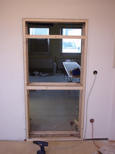 Ich habe angefangen den Rahmen für die Trockenbauwand in die ursprüngliche Tür zwischen Aufnahme und Abhörraum einzubauen. Hier kommt später auch das Fenster rein. Leider hatte ich nicht genügend Holzlatten, und so wird der Rest auf morgen verschoben.
