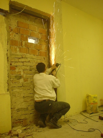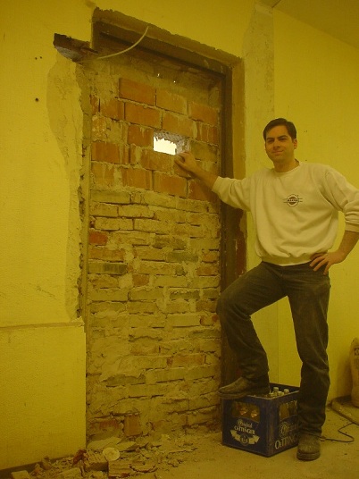 Heute habe ich den Türrahmen aus der Wand gebrochen. Erst wollte ich einfach die überstehenden Rahmenteile herausflexen, aber das hat nicht funktioniert. Also raus mit dem ganzen Ding. An einigen Stellen war der Rahmen mit Metallankern befestigt, die in der Wand eingegipst sind. Die habe ich kurzerhand (naja, eigentlich hat der Mist ganz schön lange gedauert) durchgeflext.