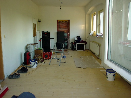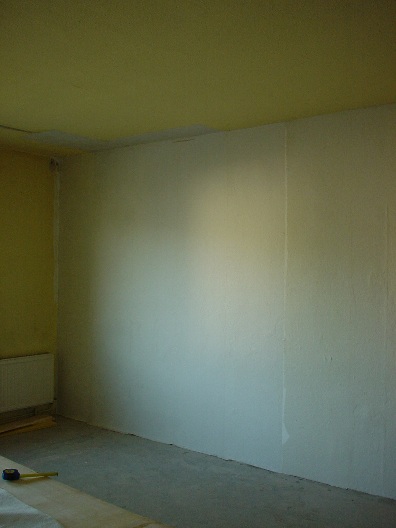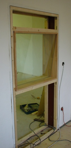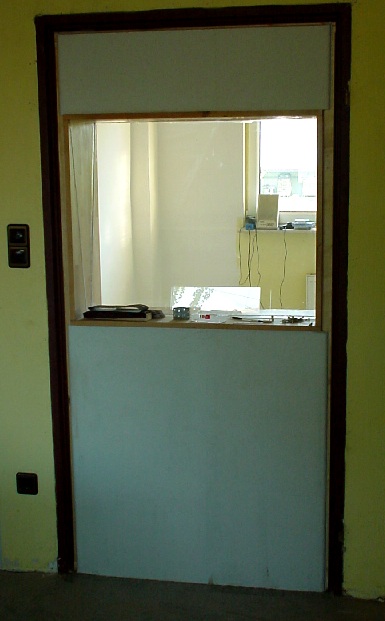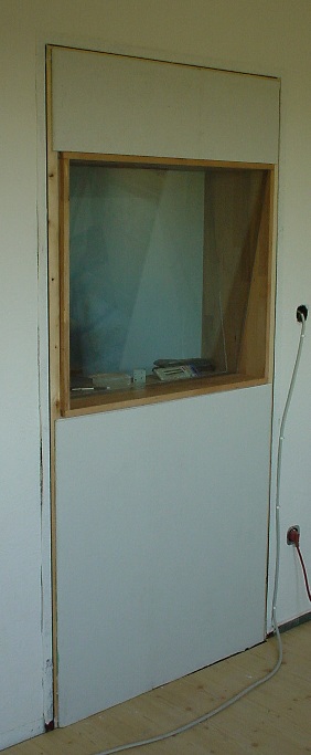 Nachdem das Fenster endlich drin war, konnte der Rest der ehemaligen Türöffnung verschlossen werden. Dazu habe ich einfach Gipsplatten auf den vorhandenen Rahmen geschraubt. Die Ränder wurden natürlich wieder mit Silikon abgedichtet. In den Zwischenraum habe ich Steinwolle gestopft, zur Schalldämmung. Das ganze funktioniert wirklich gut: Wenn man jetzt im Abhörraum die Musik laut aufdreht, kommt mehr Schall durch die beiden anderen Türen, als durch meine Trockenbauwand. Jetzt muß ich mir halt für die Türen noch was überlegen :-)