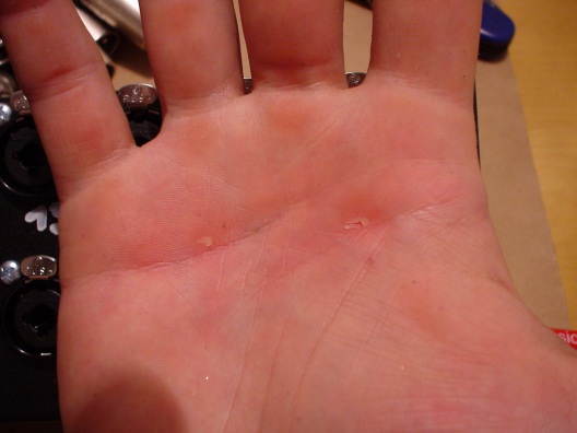 Danach habe ich die Kombi-Buchsen (das sind übrigens kombinierte XLR / Klinke Buchsen) auf das Rackblech geschraubt. Leider habe ich doch ein wenig zu dicke Schrauben genommen, obwohl es schon die dünnsten waren, die ich beim Hornbach gefunden hab. 64 Schrauben später hatte ich dann zwei nette Blasen an der rechten Hand, weil ich mir eingebildet habe, das Steckfeld müßte heute noch fertig werden, und der Akkuschrauber war nicht zur Hand.