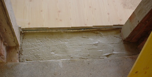 Dann habe ich angefangen das riesige Loch, welches die Türschwelle darstellt mit Füllmaterial und Mörtel auszugießen.